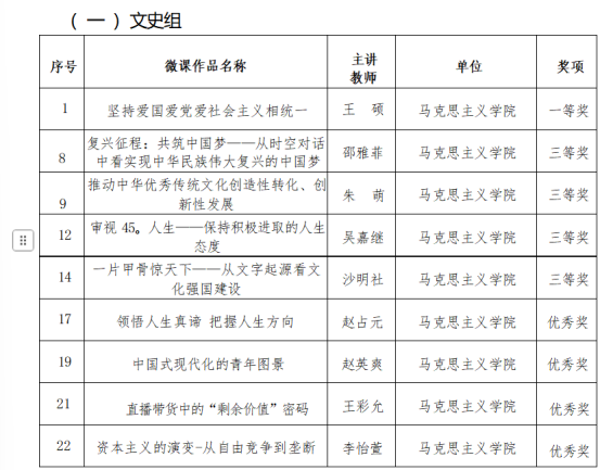 在单项奖评选中,马克思主义学院共有9项微课作品获奖,覆盖一等奖、三等奖及优秀奖等多个层次,数量与质量均位居全校前列 ,充分展示了我院在思政课教学内容创新、形式优化方面的显著成效。其中,王硕老师的作品《坚持爱国爱党爱社会主义相统一》以鲜明的主题导向、深厚的理论底蕴和富有感染力的教学表达,荣获文史组单项一等奖,充分体现了思政课“政治性与学理性相统一”的教学追求。