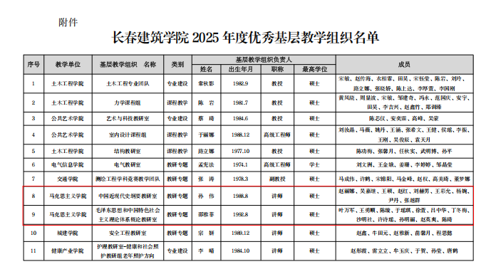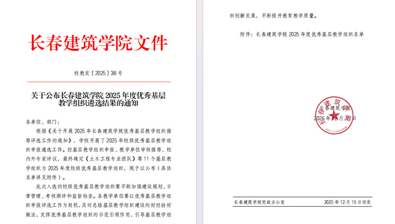 近日,长春建筑学院正式公布《2025年度校级优秀基层教学组织遴选结果》,马克思主义学院申报的“中国近现代史纲要教研室”与“毛泽东思想和中国特色社会主义理论体系概论教研室”两个基层教学组织成功入选,荣获“2025年度校级优秀基层教学组织”称号。此次双项入选,充分展现了马克思主义学院在教育教学改革、课程建设与团队发展方面的显著成效和坚实基础。
